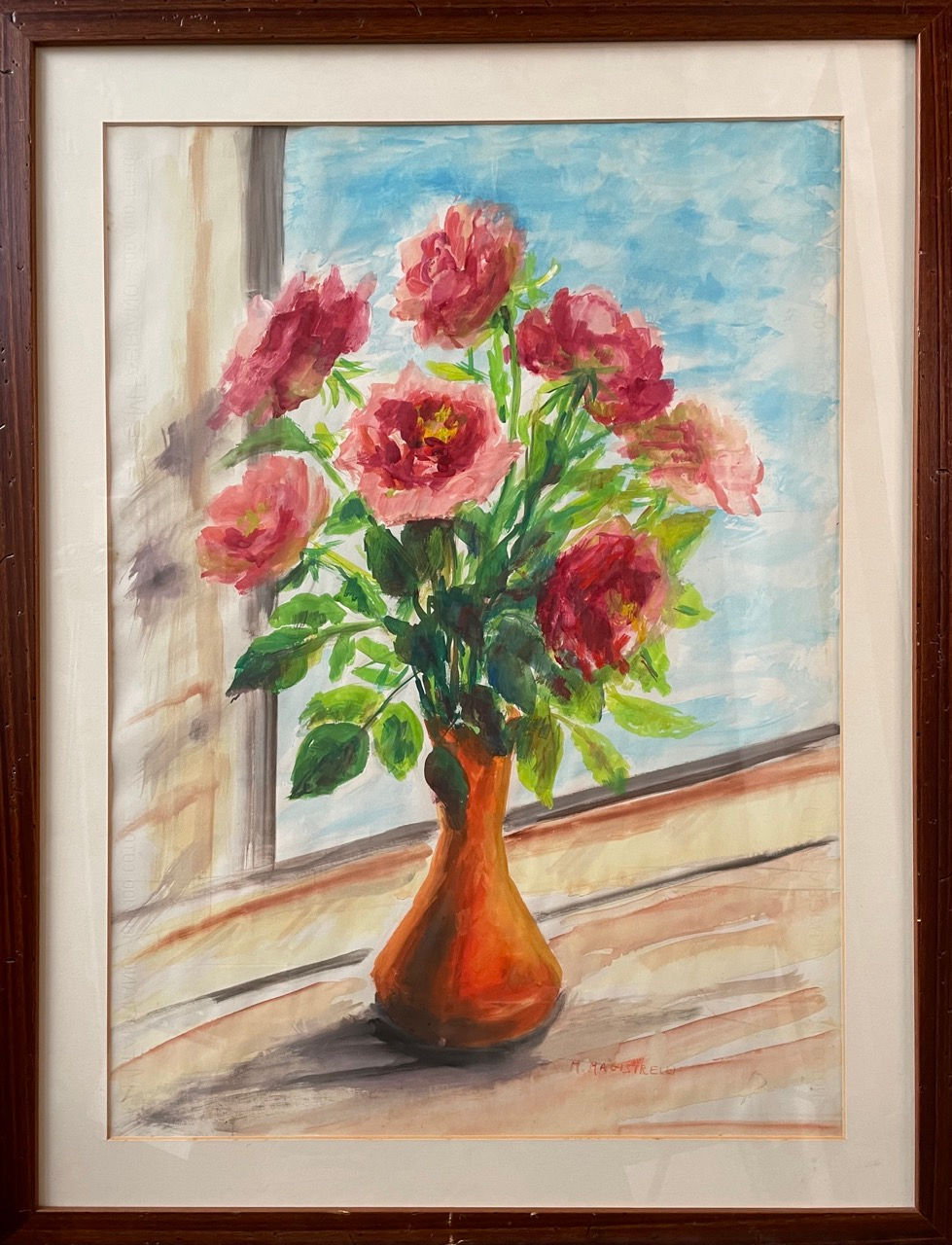 Rose in vaso arancione su davanzale