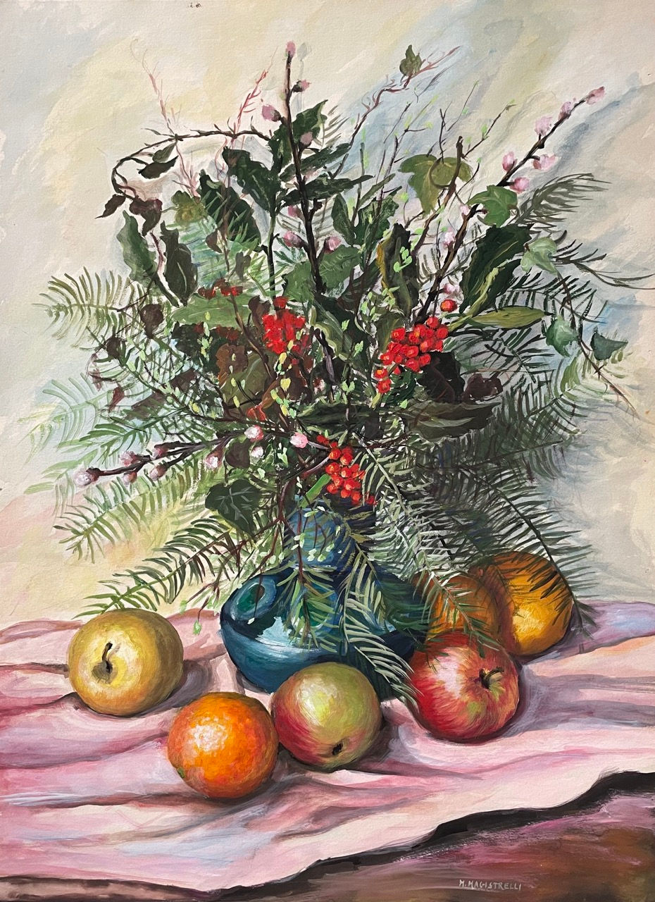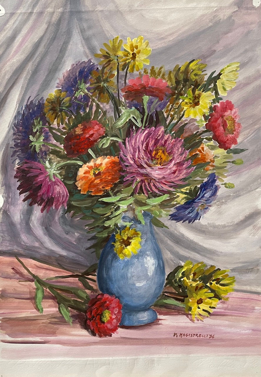 Mazzo di dalie gialle in vetro verde, uva nera e bianca